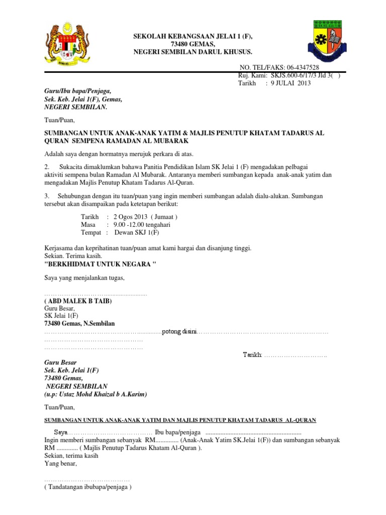 Adapun kebutuhan Dana Terlampir. Sesungguhnya fadhilat memelihara dan berbuat baik terhadap anak yatim terlalu besar ganjarannya sepertimana sabda Rasulullah SAW. A surat memohon sumbangan ikhlas untuk anak yatim dan murid miskin Surat jemputan menerima sumbangan hari raya.